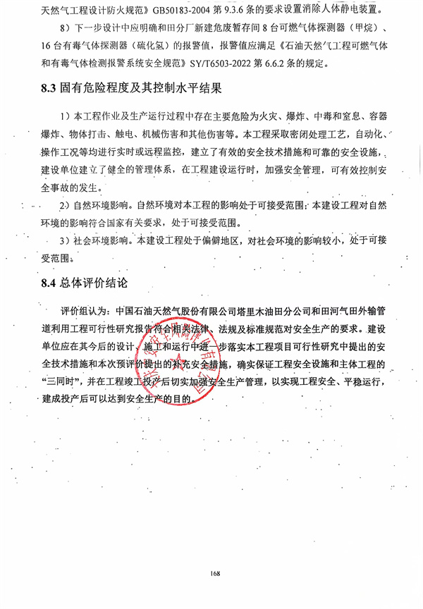 中國石油天然氣股份有限公司塔里木油田分公司和田河氣田外輸管道利用工程可行性研究報告符合相關法律、法規及標準規范對安全生產的要求。建設單位應在其今后的設計、施工和運行中進一步落實本工程項目可行性研究中提出的安全技術措施和本次預評價提出的補充安全措施,確實保證工程安全設施和主體工程的“三同時”,并在工程竣工投產后切實加強安全生產管理,以實現工程安全、平穩運行,建成投產后可以達到安全生產的目的。 |