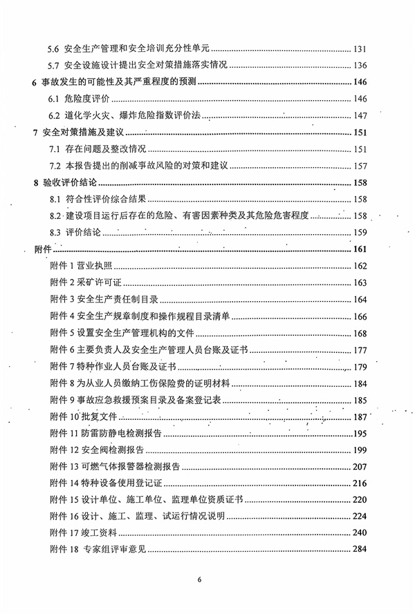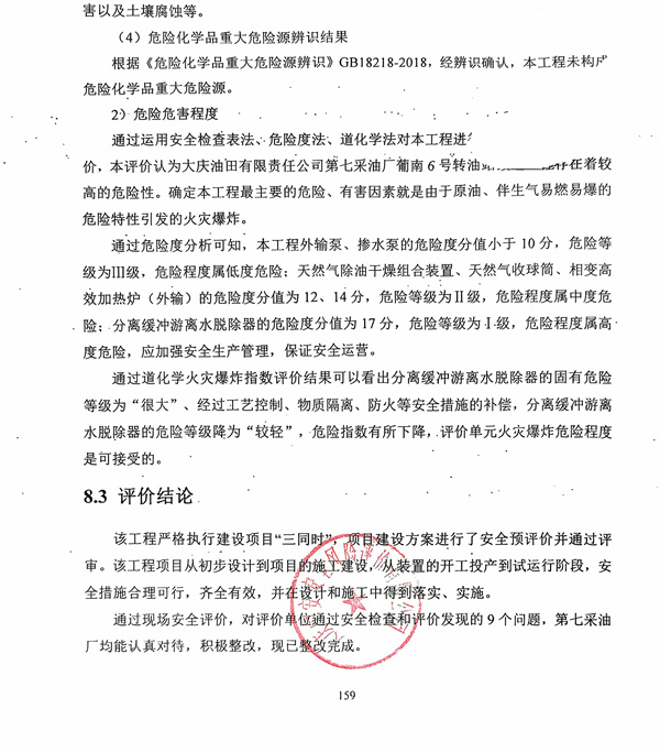 該工程嚴(yán)格執(zhí)行建設(shè)項(xiàng)目“三同時(shí)”,項(xiàng)目建設(shè)方案進(jìn)行了安全預(yù)評(píng)價(jià)并通過評(píng)審。該工程項(xiàng)目從初步設(shè)計(jì)到項(xiàng)目的施工建設(shè),從裝置的開工投產(chǎn)到試運(yùn)行階段,安全措施合理可行,齊全有效,并在設(shè)計(jì)和施工中得到落實(shí)、實(shí)施。 通過現(xiàn)場(chǎng)安全評(píng)價(jià),對(duì)評(píng)價(jià)單位通過安全檢查和評(píng)價(jià)發(fā)現(xiàn)的9個(gè)問題,第七采油廠均能認(rèn)真對(duì)待,積極整改,現(xiàn)已整改完成。 結(jié)論:大慶油田有限責(zé)任公司第七采油廠葡南6號(hào)轉(zhuǎn)油站改造工程安全設(shè)施符合“三同時(shí)”要求,試運(yùn)行情況良好,安全生產(chǎn)管理有效,具備安全驗(yàn)收的條件。 |