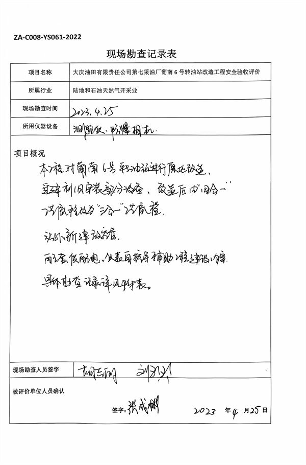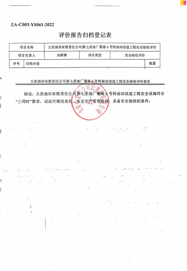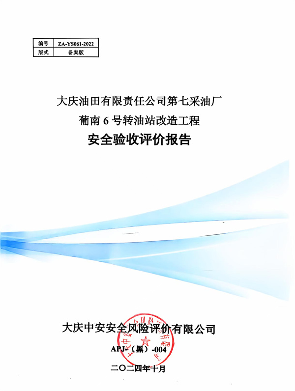 大慶油田有限責(zé)任公司第七采油廠葡南6號(hào)轉(zhuǎn)油站改造工程安全驗(yàn)收評(píng)價(jià)報(bào)告 |