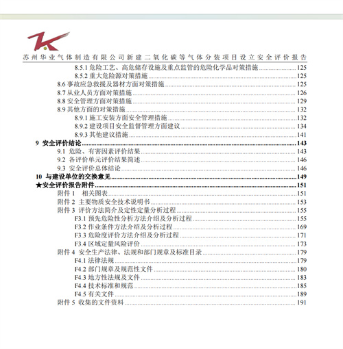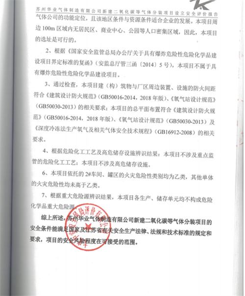 蘇州華業氣體制造有限公司新建二氧化碳等氣體分裝項目的安全條件能滿足國家及江蘇省有關安全生產法律、法規和技術標準的規定和要求,項目的安全風險程度在可接受的范圍。 |