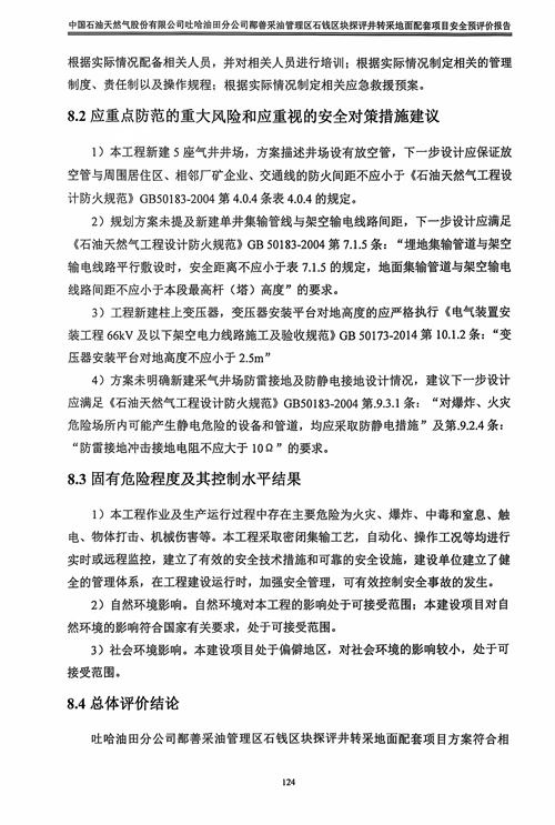 吐哈油田分公司鄯善采油管理區石錢區塊探評井轉采地面配套項目方案符合相關法律、法規及標準規范對安全生產的要求。建設單位應在其今后的設計、施工和運行中進一步落實本工程方案提出的安全技術措施和本次預評價提出的補充安全措施,確實保證工程安全設施和主體工程的“三同時”,并在工程竣工投產后切實加強安全生產管理,以實現工程安全、平穩運行,本項目危險有害因素能夠得到控制,建成投產后,能達到有關法律、法規及標準規定的安全要求。 |