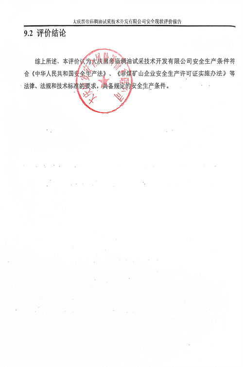 本評價認為大慶黑帝廟稠油試采技術開發有限公司安全生產條件符合《中華人民共和國安全生產法》、《非煤礦山企業安全生產許可證實施辦法》等法律、法規和技術標準的要求,具備規定的安全生產條件。 |