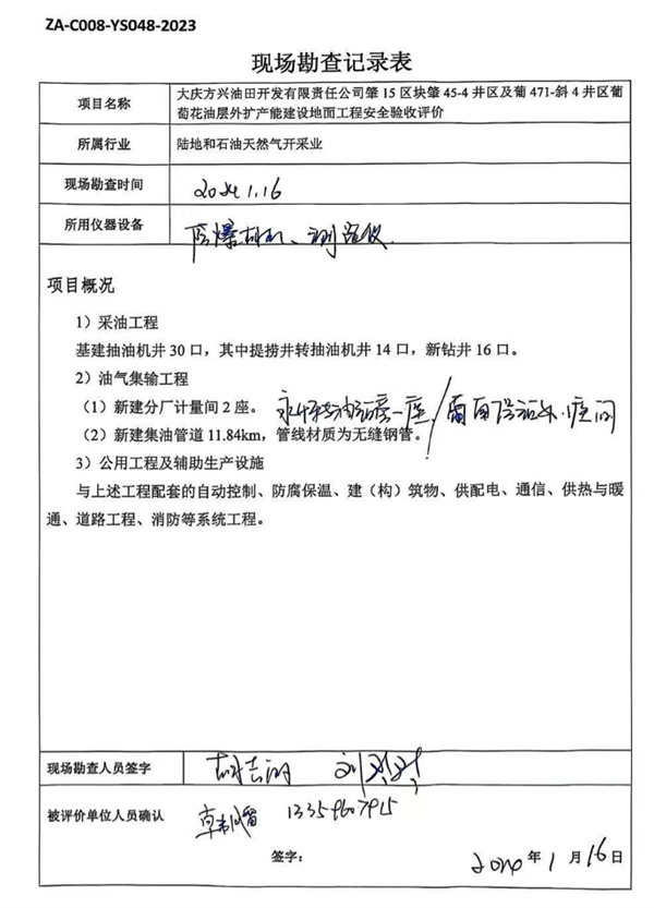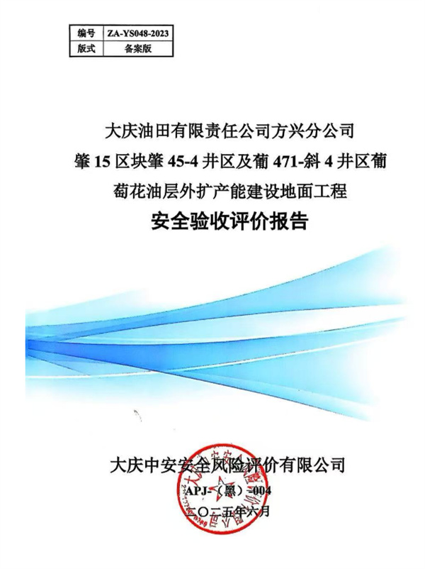 大慶油田有限責任公司方興分公司肇15區塊肇45-4井區及葡471-斜4井區葡萄花油層外擴產能建設地面工程安全驗收評價 |