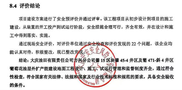 大慶油田有限責任公司方興分公司肇15區塊肇45-4井區及葡471-斜4井區葡萄花油層外擴產能建設地面工程設計、施工、試運行管理和監督制度齊全,通過符合性檢查,符合國家有關法律、法規和國家及行業技術標準和規范的要求,具備安全驗收的條件。 |