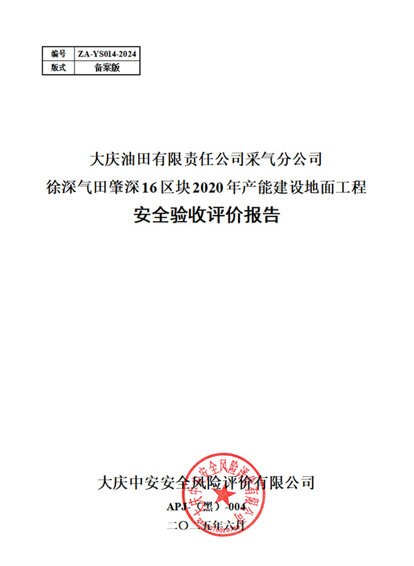大慶油田有限責任公司采氣分公司徐深氣田肇深16區塊2020年產能建設地面工程 安全驗收評價