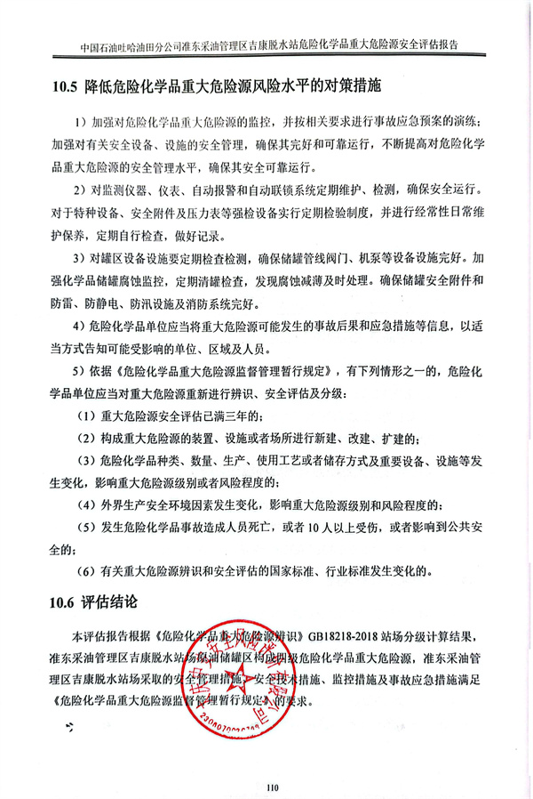 本評估報告根據《危險化學品重大危險源辨識》GB18218-2018站場分級計算結果,準東采油管理區吉康脫水站場原油儲罐區構成四級危險化學品重大危險源,準東采油管理區吉康脫水站場采取的安全管理措施、安全技術措施、監控措施及事故應急措施滿足《危險化學品重大危險源監督管理暫行規定》的要求。 |