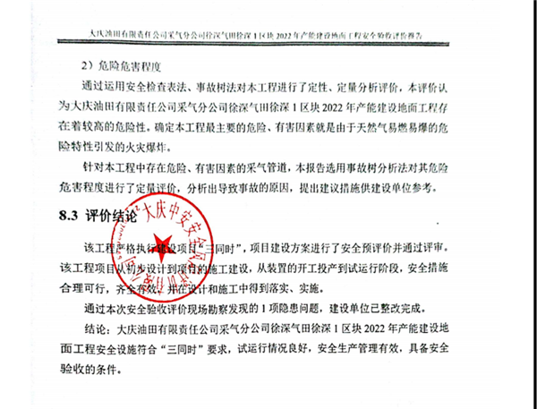 大慶油田有限責任公司采氣分公司徐深氣田徐深1區塊2022年產能建設地面工程安全驗收評價報告 |
