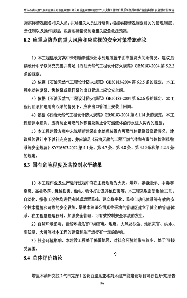 塔里木油田克拉2氣田克探1區塊白堊系亞格列木組產能建設項目可行性研究報告符合相關法律、法規及標準規范對安全生產的要求。建設單位應在其今后的設計、施工和運行中進一步落實本工程可研報告提出的安全技術措施和本次預評價提出的補充安全措施,切實保證工程安全設施和主體工程的“三同時”,并在工程竣工投產后切實加強安全生產管理,以實現工程安全、平穩運行,建成投產后可以達到安全生產的目的。 |