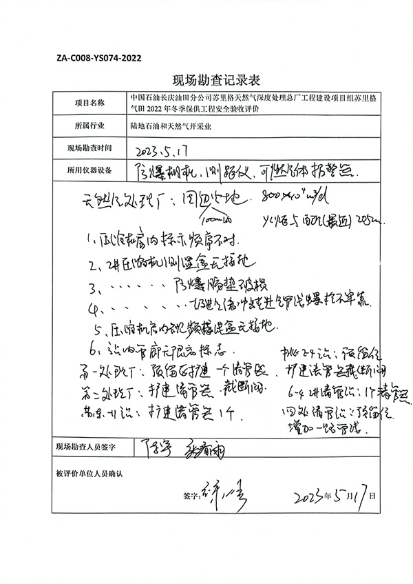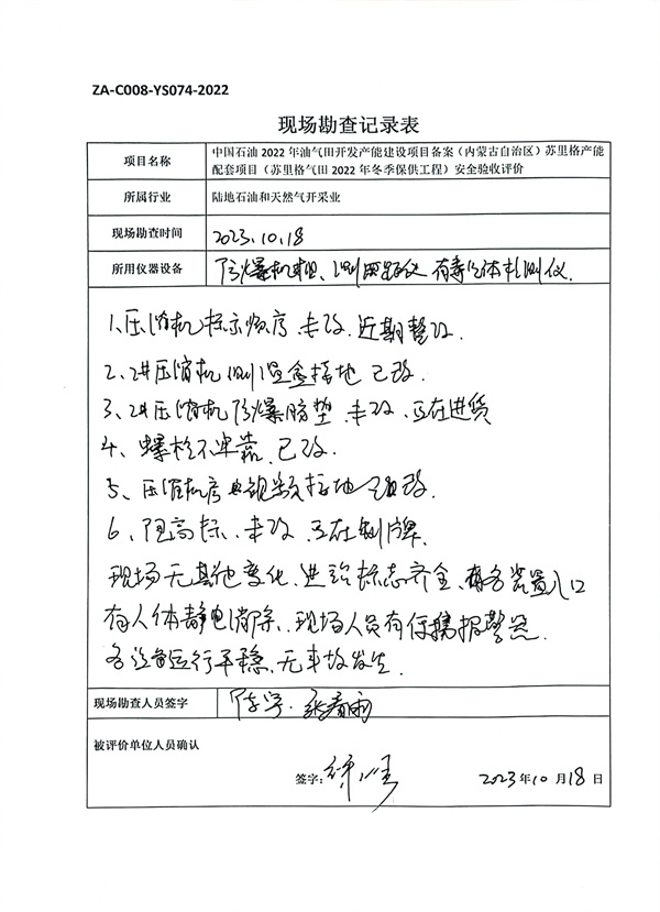 中國石油2022年油氣田開發產能建設項目備案(內蒙古自治區)蘇里格產能配套項目(蘇里格氣田2022年冬季保供工程)安全設施設置和運行符合安全生產要求,試運行情況良好,安全生產管理有效,具備安全驗收的條件。 |