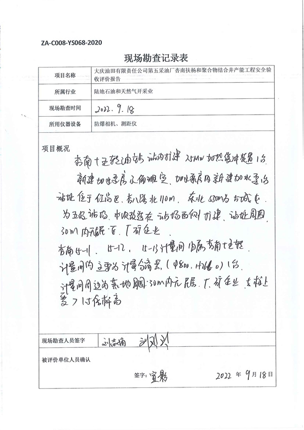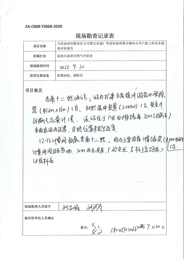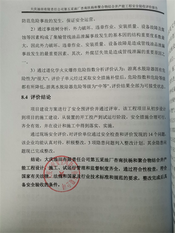 大慶油田有限責任公司第五采油廠杏南扶楊和聚合物結合井產能工程設計、施工、試運行管理和監督制度齊全,通過符合性檢查,符合國家有關法律、法規和國家及行業技術標準和規范的要求,整改完成后具備安全驗收的條件。 |
